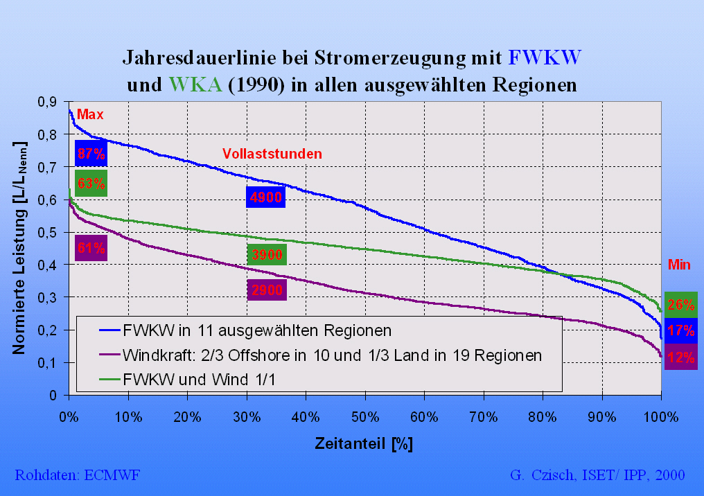 Jahresdauerlinien bei Stromerzeugung mit Fallwindkraftwerken (FWKW) und WKA (1990) (getrennte und gemeinsame Stromerzeugung)