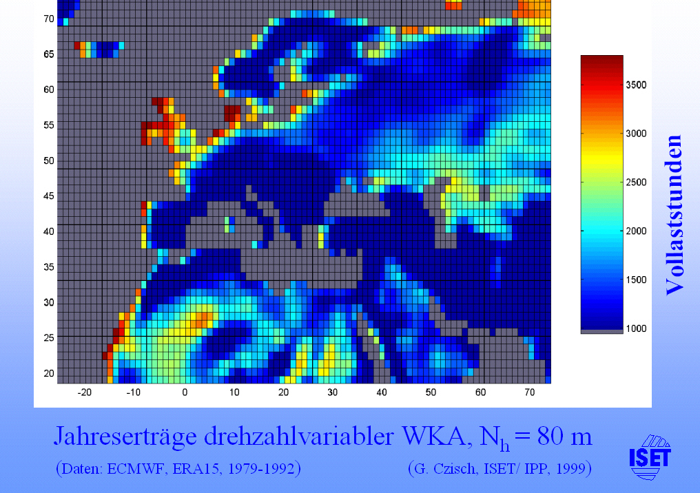 Jahreserträge drehzahlvariabler WKA (NH=80m), Europa - Land