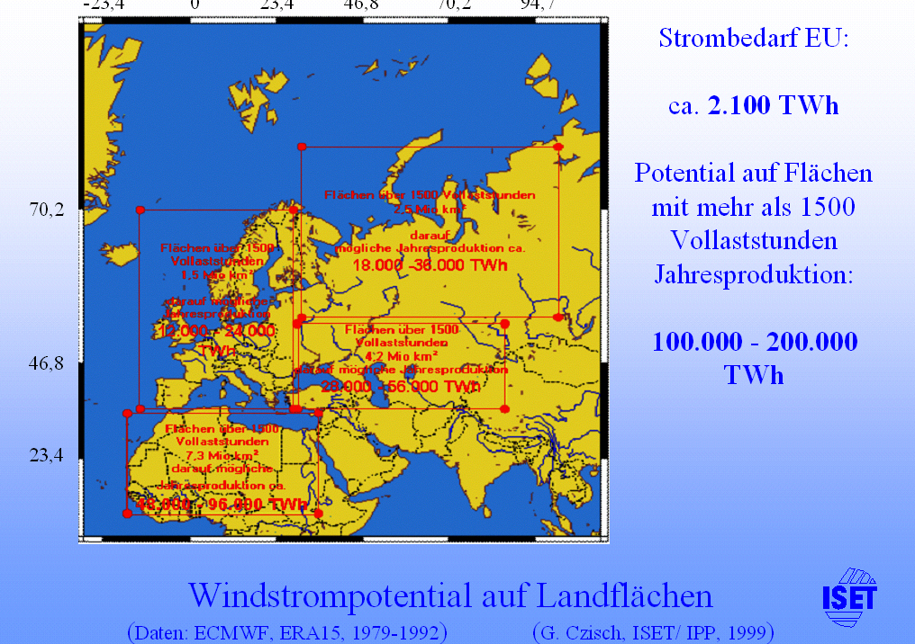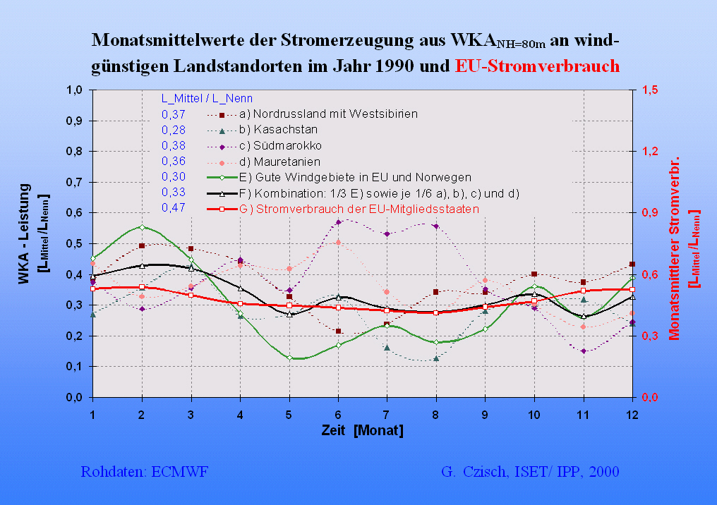 Monatsmittelwerte der Stromerzeugung aus WKA (NH=80m) an windgünstigen Landstandorten 1990 und EU-Strombedarf