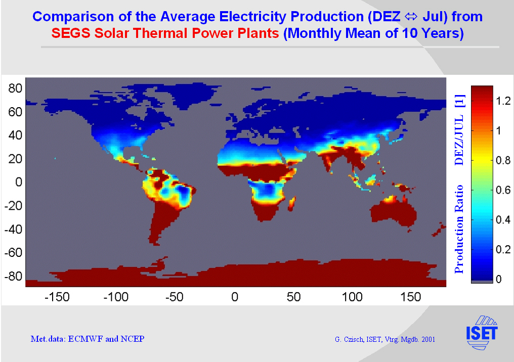 The seasonal variation of power production from SEGS power plants is significantly loeer at lower latitudes.