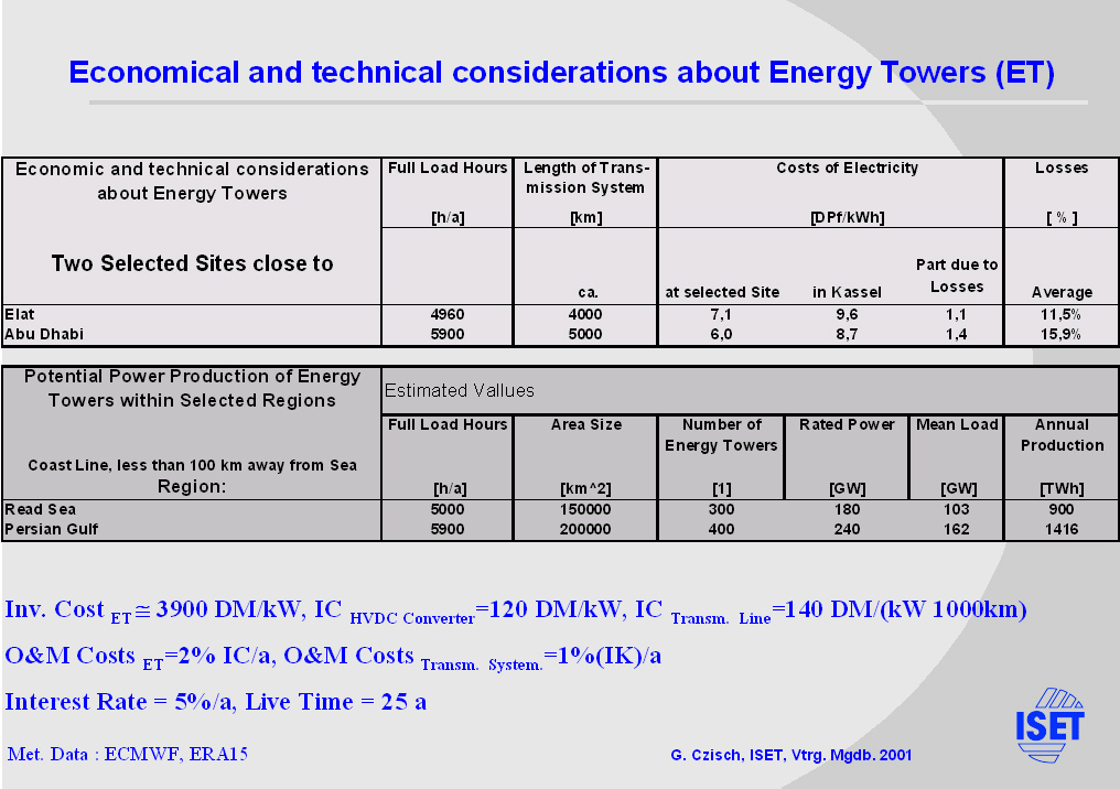 transmission systems and based on estimations for the Energy Towers - both shown below the tables - the costs of electricity are calculated for two selected sites.
