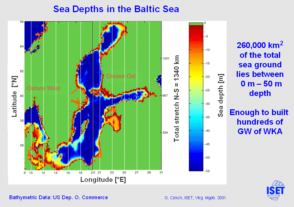 displayed for the Baltic Sea. The total area flatter than 50 m is 260000 km^2. At 4 MW/km^2 this would be sufficient for 1000 GW of erected wind turbines and
