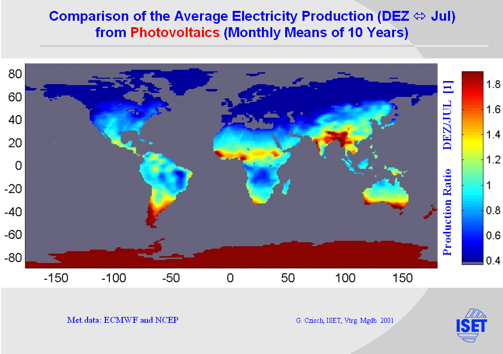 The seasonal variation of power production from PV panels is significantly lower at lower latitudes. On this slide you can see for
