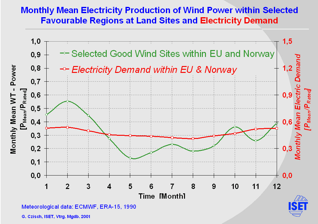 that the fluctuations of the production vary much more than the demand. Europe is a typical winter wind region with maxima in winter and minima in the summer