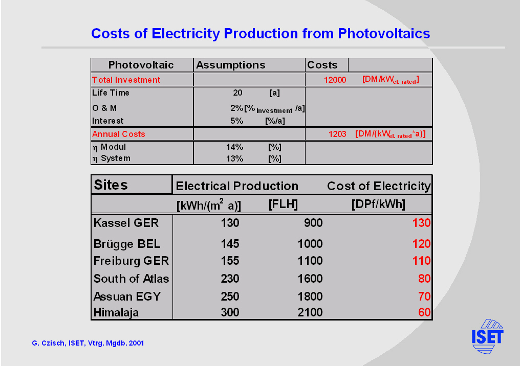 With the underlying economic assumptions shown in the upper table the costs of PV electricity production at some selected sites