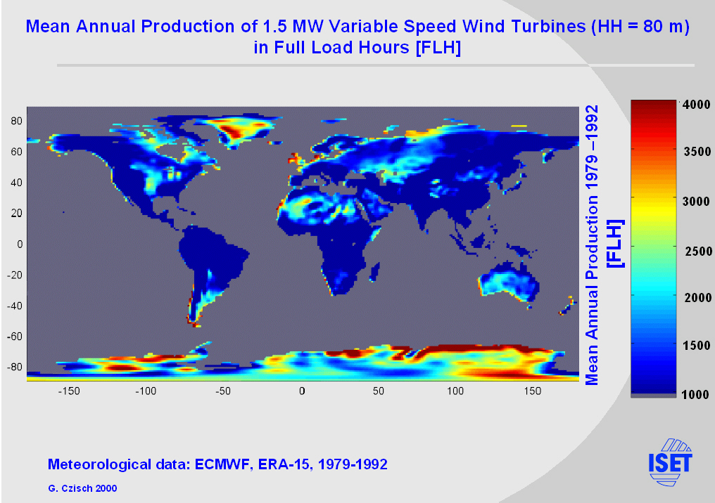 Here you can see the potential production of wind energy calculated from data of the European Centre for Medium Range Weather Forecast expressed in FLH. Europe itself has good wind conditions. But its use is limited by the high population density. In a belt 4000 to 5000 km away from Kassel there are also very good wind conditions and in most of the areas the population density is 2 orders of magnitude smaller than for example in Germany. |