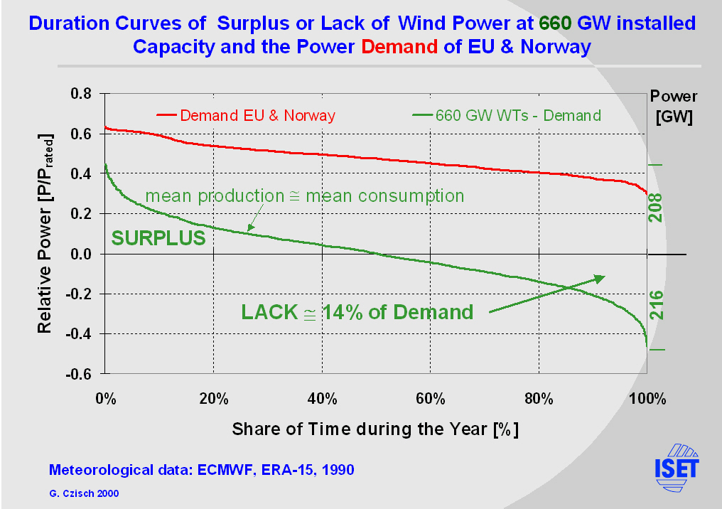The difference between wind power production and demand is shown in the green line. The maximum power surplus and lack are each roughly 200 GW. The lack of energy amounts to 14% of the demand. |