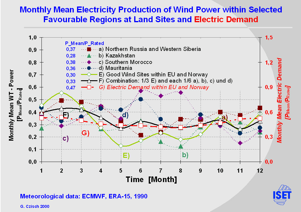 On the slide you see all monthly time series of the potential wind power production within the selected regions as well as the result for combined production and the demand of EU & Norway. |