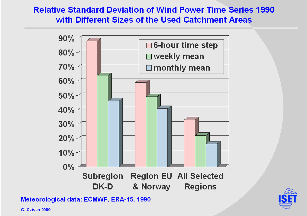 In general the fluctuations rapidly decline with the size of the catchment area (see also REFERENCES [8] in the text version). For the simultaneous use of all regions mentioned the relative standard deviations are for all averaging times close to 30% of those within the area DK-D. The production is much smoother and the need of fast reactions to changes as well as of storage systems is significantly lower. |
